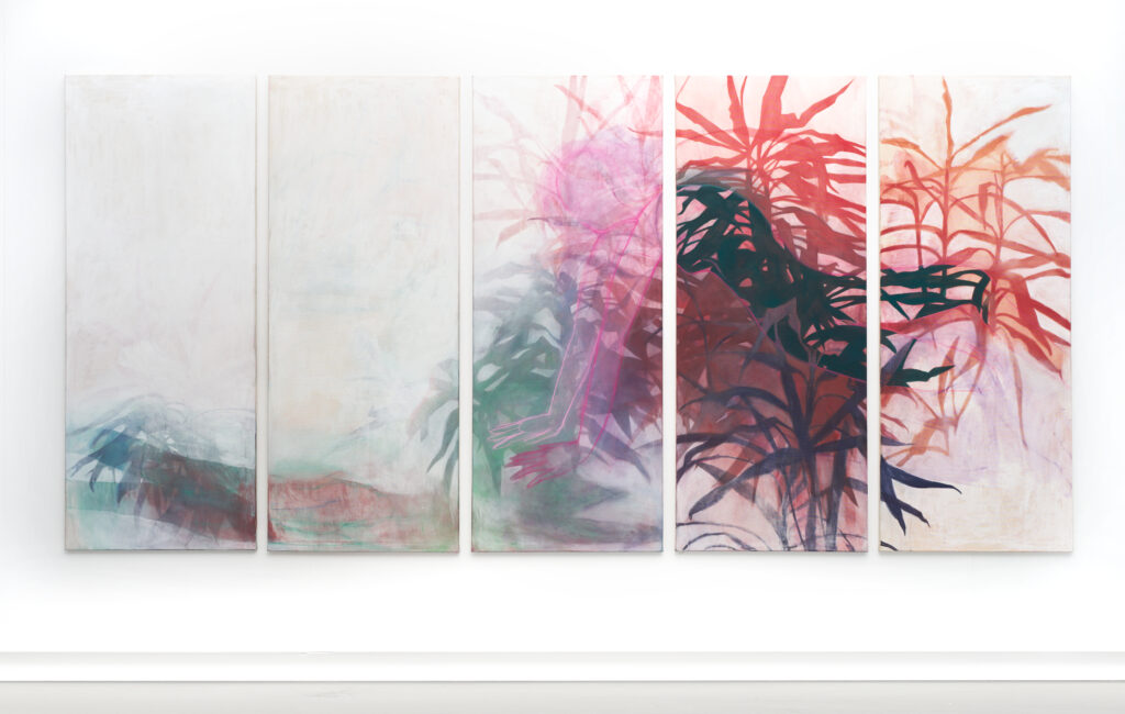 unter uns, 5 panels a 80x200cm, 2025, distemper on canvas